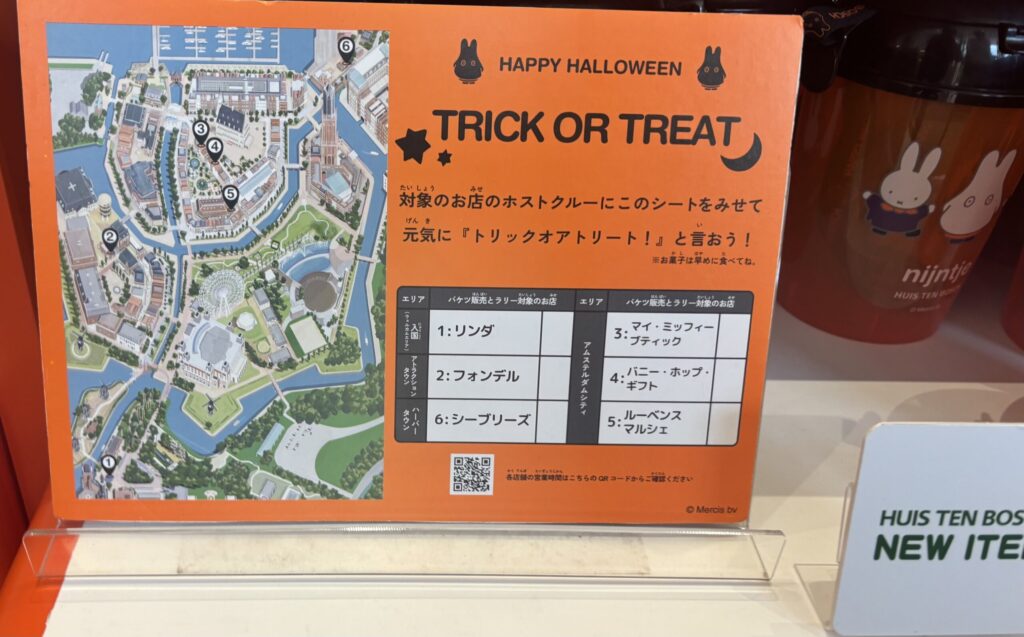 子どもが「ミッフィーのお菓子入れ&シート」を持って、決まったお店で「トリックオアトリート!」と言えばお菓子をゲット、という仕組み。街歩きそのものがイベントです。