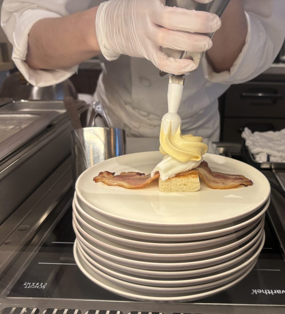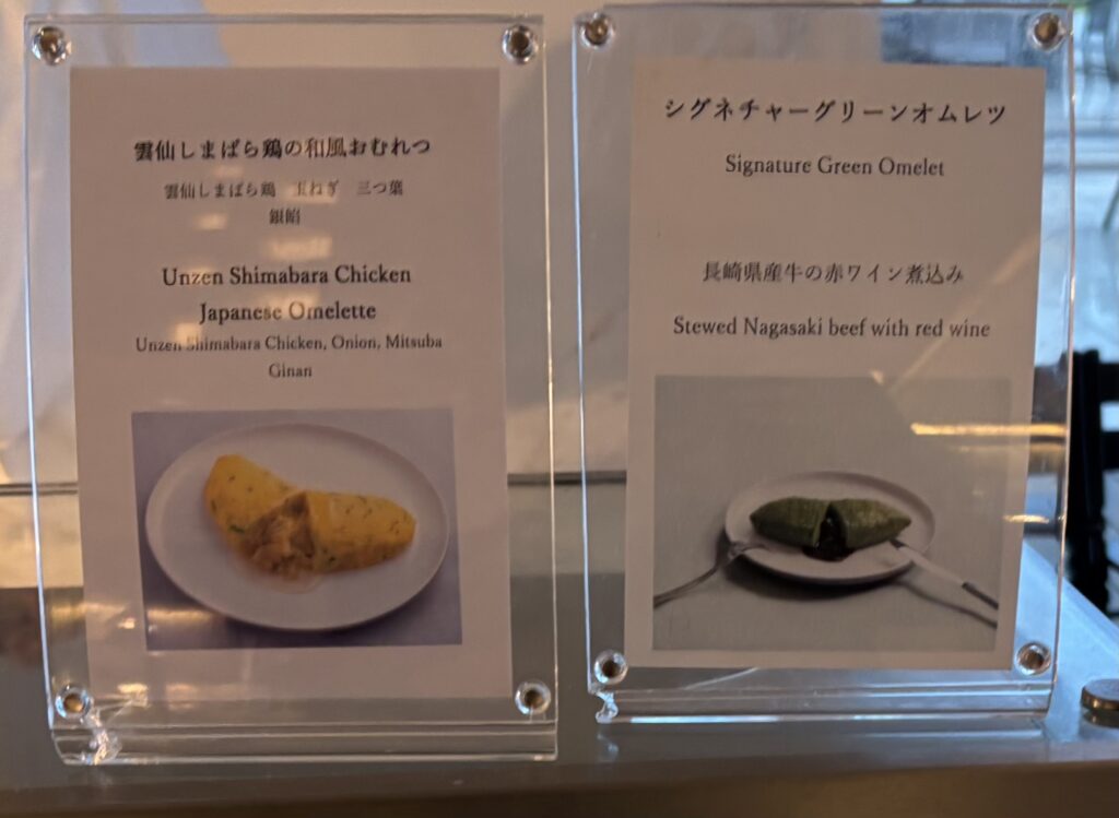 シェフが目の前でオムレツ・エッグベネディクトをつくってくれるライブ感もあり。中でも“牛肉入りオムレツ”という珍しい一皿が「おっ!」と印象的でした。